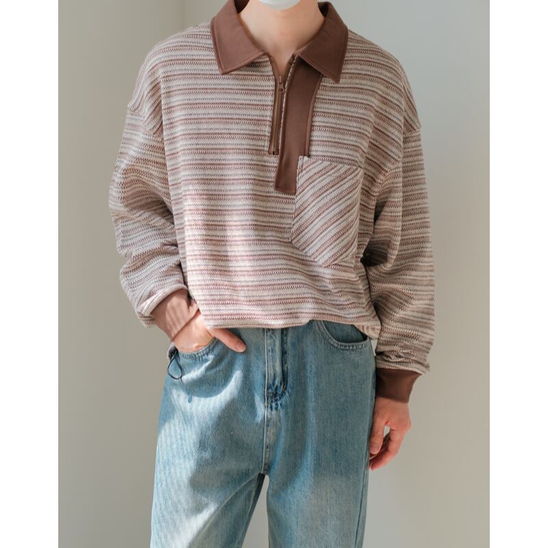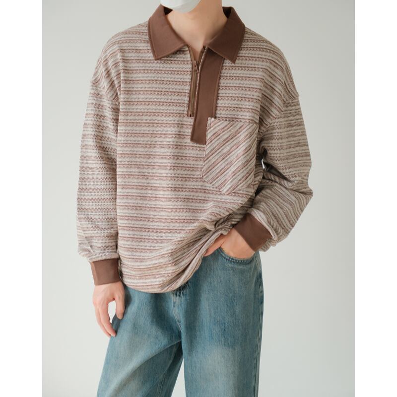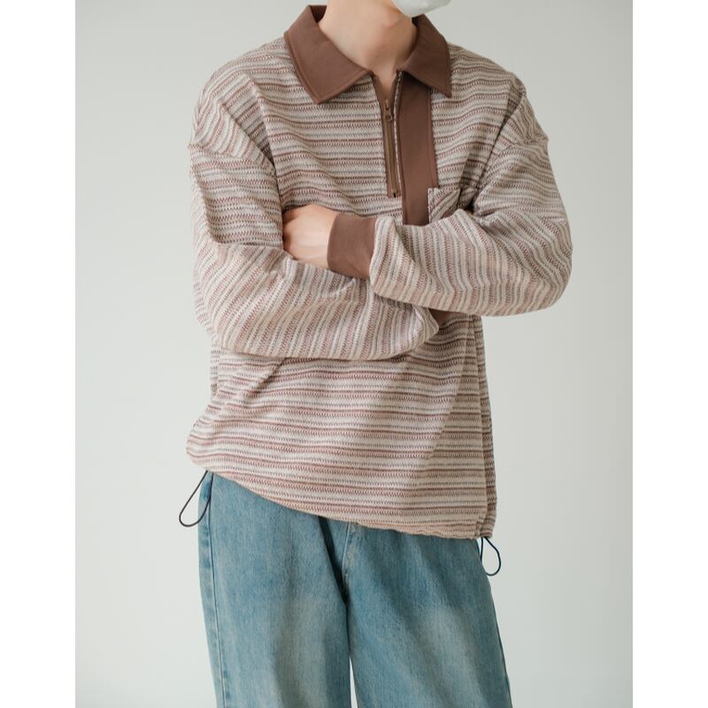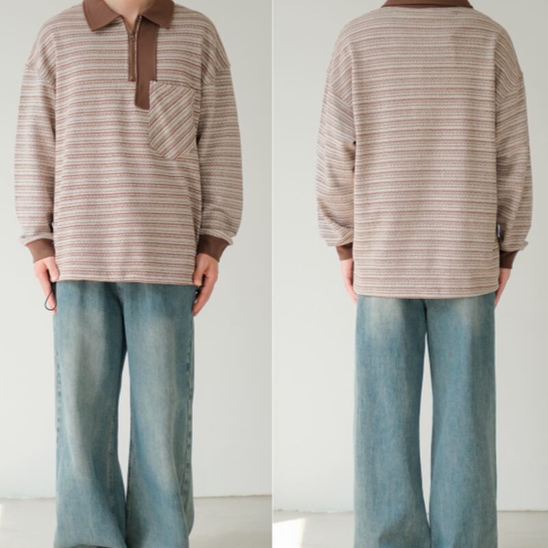 落ち着いた色合いのボーダー柄が、大人の余裕を感じさせる一枚。ハーフジップアップのデザインは、着こなしの幅を広げ、カジュアルながらも洗練された印象を与えます。普段使いはもちろん、休日のお出かけにもぴったりです。
