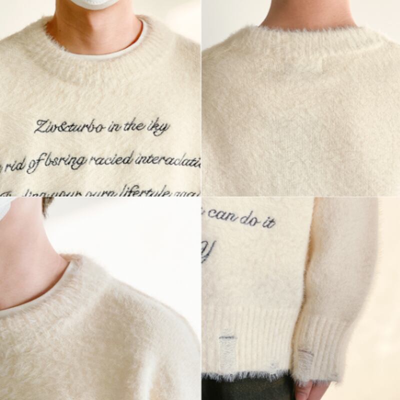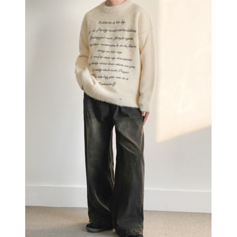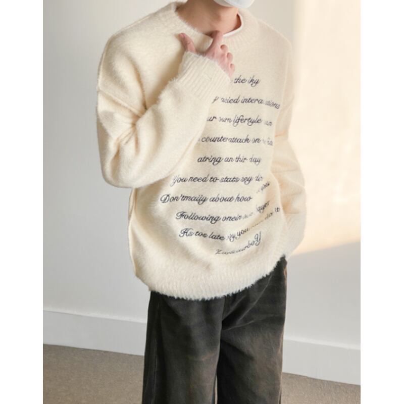 ゆったりとしたオーバーサイズのクルーネックニット。メッセージプリントが特徴的で、普段着に個性をプラスします。カジュアルなスタイルからきれいめスタイルまで幅広くコーディネート可能です。一枚で着ても、シャツやTシャツとのレイヤードスタイルにもおすすめです。