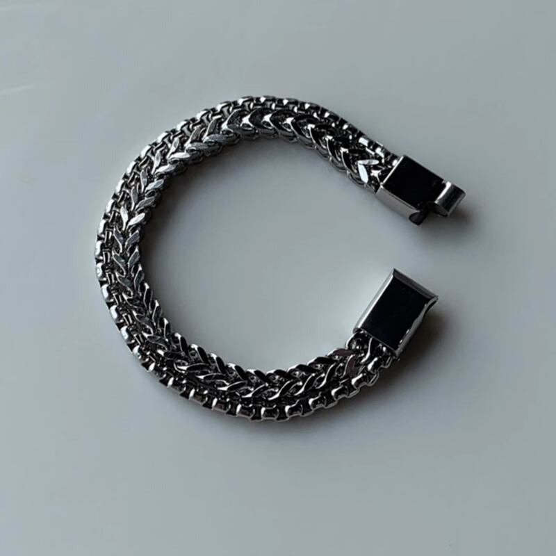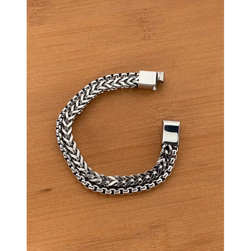 重ね付けでこなれ感を演出できる、2連デザインのブレスレットです。フィガロチェーンと、幾何学模様のようなチェーンの2種類の異なるデザインを組み合わせることで、シンプルながらも洗練された印象に。カジュアルなスタイルからきれいめスタイルまで、幅広いコーディネートに合わせやすく、デイリー使いに最適です。手首を華奢に見せ、さりげないアクセントとして活躍します。