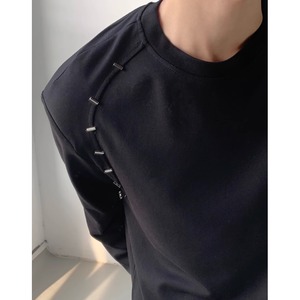 肩部分のメタリックな装飾が目を引く、ロングスリーブクルーネックカットソー。シンプルながらも個性を主張できるデザインは、普段のスタイルにさりげないアクセントを加えたい方にぴったりです。クリーンな印象のホワイトカラーは、様々なボトムスと合わせやすく、着回し力も抜群。一枚持っておくと重宝する、万能アイテムです。