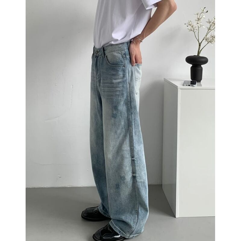 ハイウエストデザインとワイドレッグシルエットが魅力的な一本。こなれたダメージ加工が、カジュアルながらも洗練された印象を与えます。普段使いはもちろん、ちょっとしたお出かけにも活躍する万能なアイテムです。ゆったりとした履き心地で、一日中快適に過ごせます。