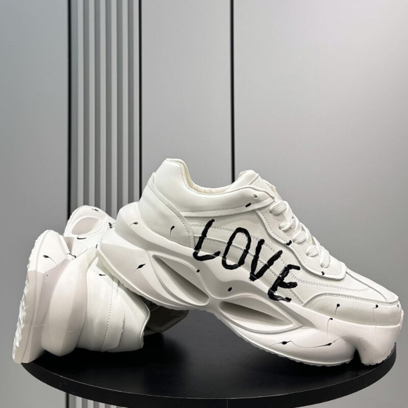 厚底ローカットスニーカーで、スタイリッシュな足元に。大胆な「LOVE」プリントが個性を際立たせます。カジュアルなスタイルから、トレンド感あふれる着こなしまで、幅広いシーンで活躍します。履くだけで気分が上がる、そんな一足です。
