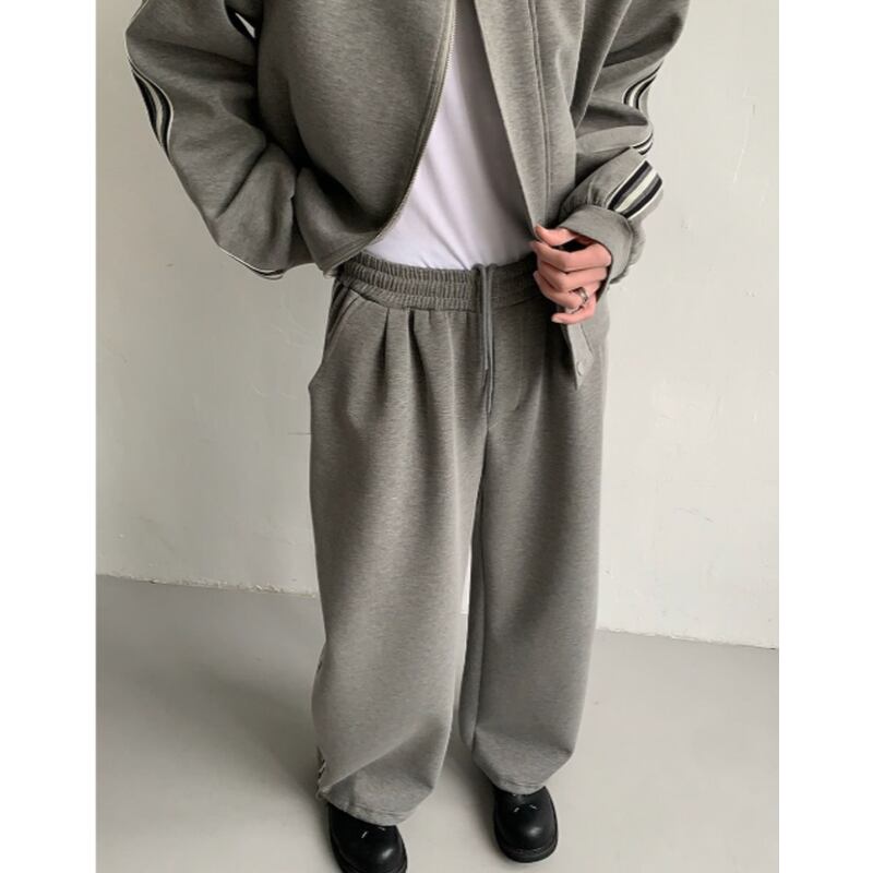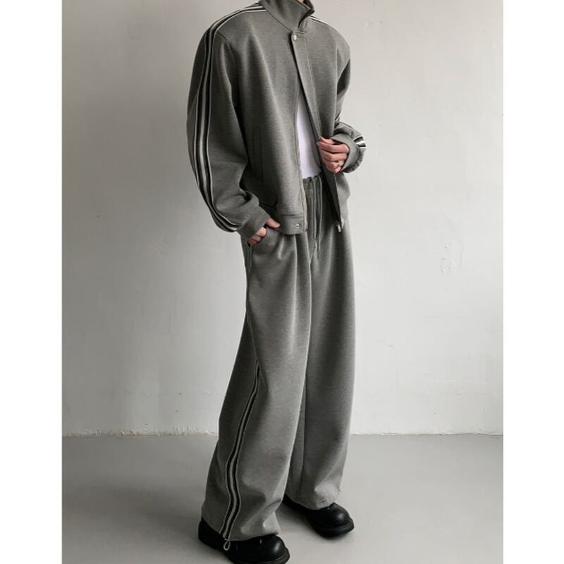 スタンドカラーのジップアップジャケットとジャージパンツのセットアップ。シンプルながらも洗練されたデザインで、様々なスタイルに合わせやすいアイテムです。ジャケットの袖にはさりげなくラインが入っており、スポーティなアクセントになっています。パンツはストレートシルエットで、快適な着心地とすっきりとしたシルエットを両立。カジュアルなシーンから、ちょっとしたお出かけまで幅広く活躍します。