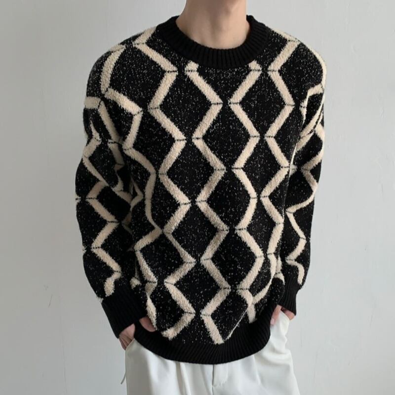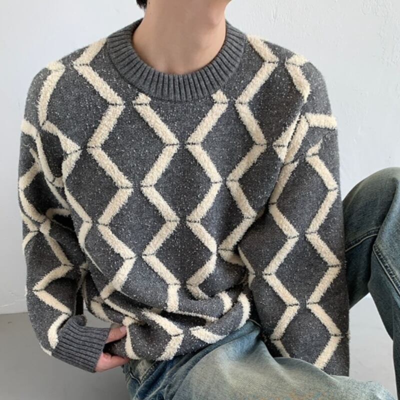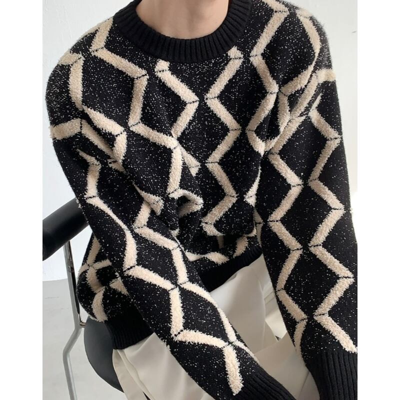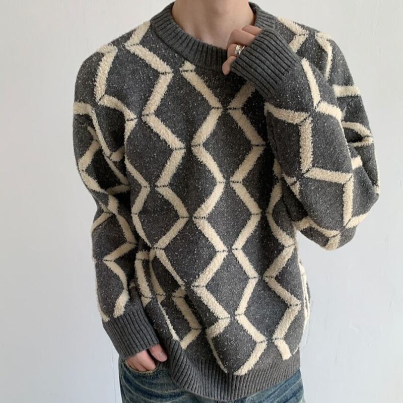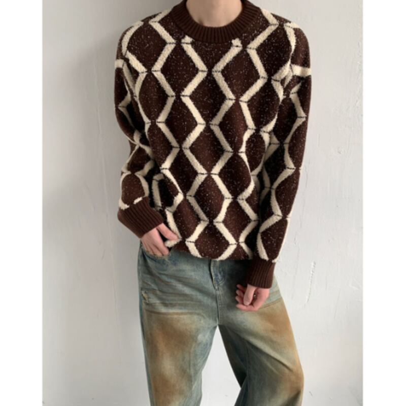 geometric pattern knit material long sleeve crew neck sweater mr0498