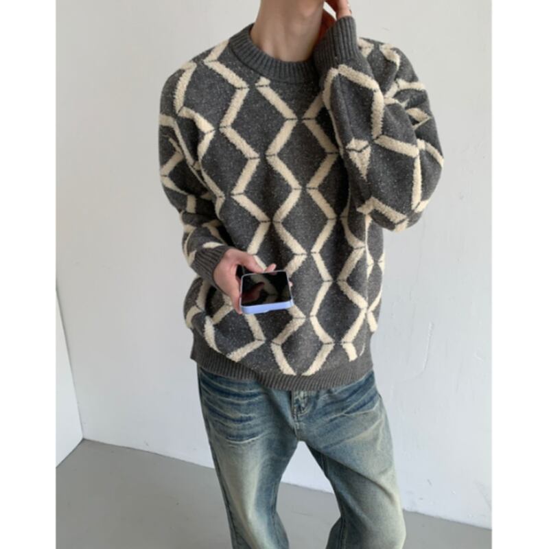 スタイリッシュな幾何学模様が魅力のニットセーター。長袖クルーネックのデザインは、どんなボトムスとも相性抜群。シンプルながらも存在感があり、着るだけでコーディネートのアクセントになります。オフィスシーンやカジュアルなオフの日など、様々なシーンで活躍してくれること間違いなしです。
