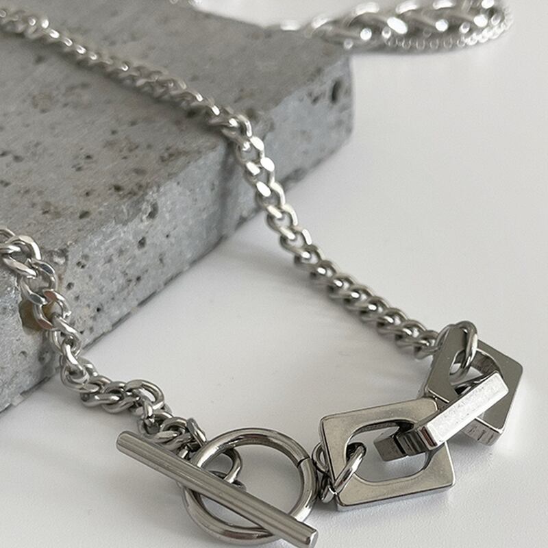 メタルチェーンと幾何学模様の組み合わせが、モダンな雰囲気を演出するネックレスです。Tバークラスプを採用することで、着脱が容易でありながら、高級感を損なうことなく、洗練されたデザインに仕上げられています。シンプルながらも存在感のあるアイテムで、あなたの装いをワンランクアップさせます。
