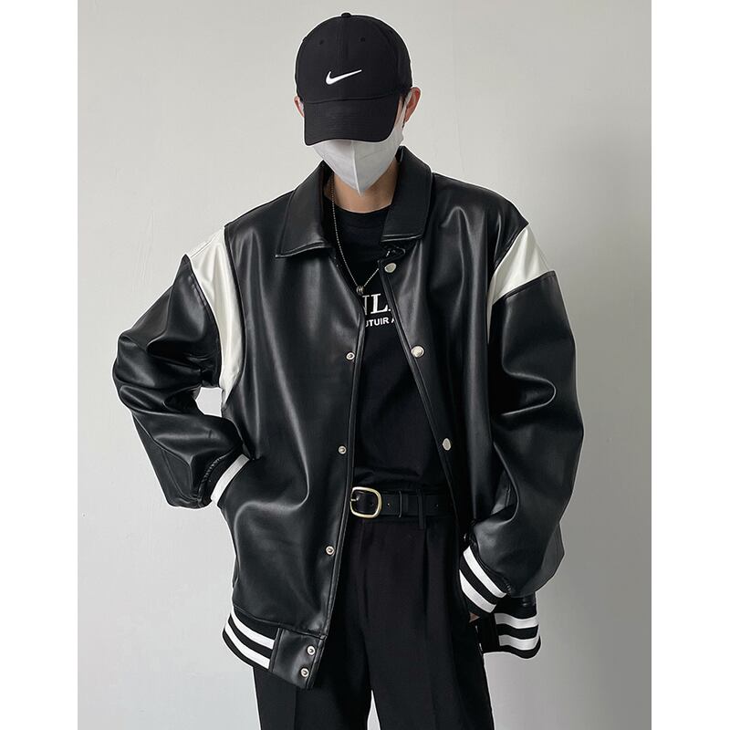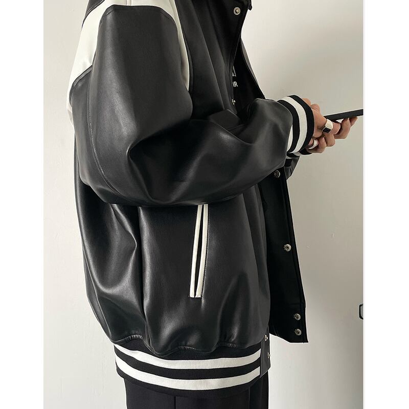 都会的なスタイルにぴったりの、フェイクレザー素材のジャケットです。袖のホワイトラインが、シンプルなデザインの中にスポーティな印象を与え、個性を際立たせます。デザイン性だけでなく、着回しやすさも抜群。普段使いはもちろん、ちょっとしたお出かけにも最適です。様々なコーディネートに合わせやすく、幅広いスタイルに対応できます。