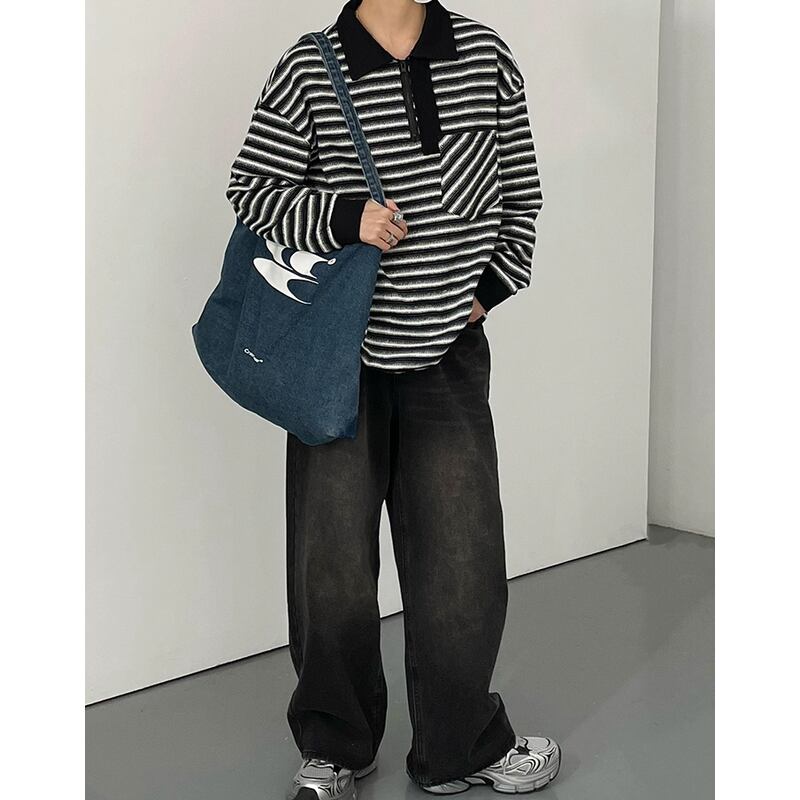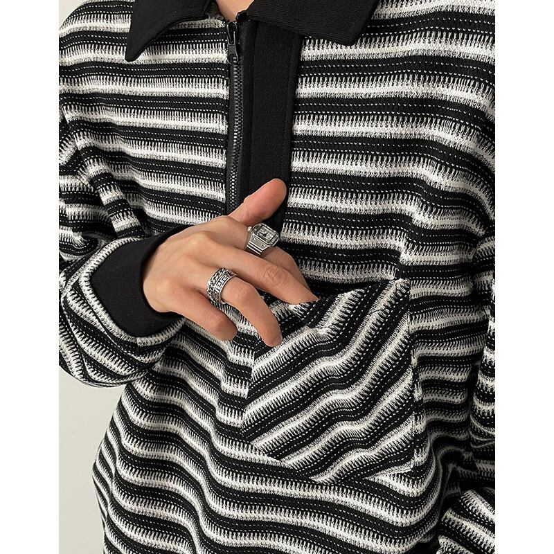 スタイリッシュなストライプ柄が魅力のハーフジップニットトップです。カジュアルなデザインながら、ハーフジップと襟元のデザインが上品さをプラス。一枚で着こなすのはもちろん、ジャケットやコートのインナーとしても活躍します。様々なボトムスと合わせやすく、デイリーユースに最適です。