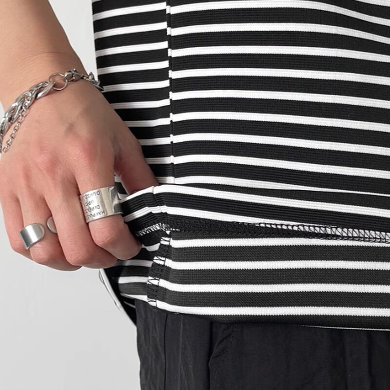 シンプルながらも洗練されたデザインが魅力の半袖Tシャツ。ブラックとホワイトのストライプ柄が、さりげない個性を演出します。大きめのパッチポケットがアクセントとなり、カジュアルなスタイルにぴったり。一枚で着ても、レイヤードスタイルにも合わせやすい万能アイテムです。デイリーユースはもちろん、休日のリラックスシーンにもおすすめです。