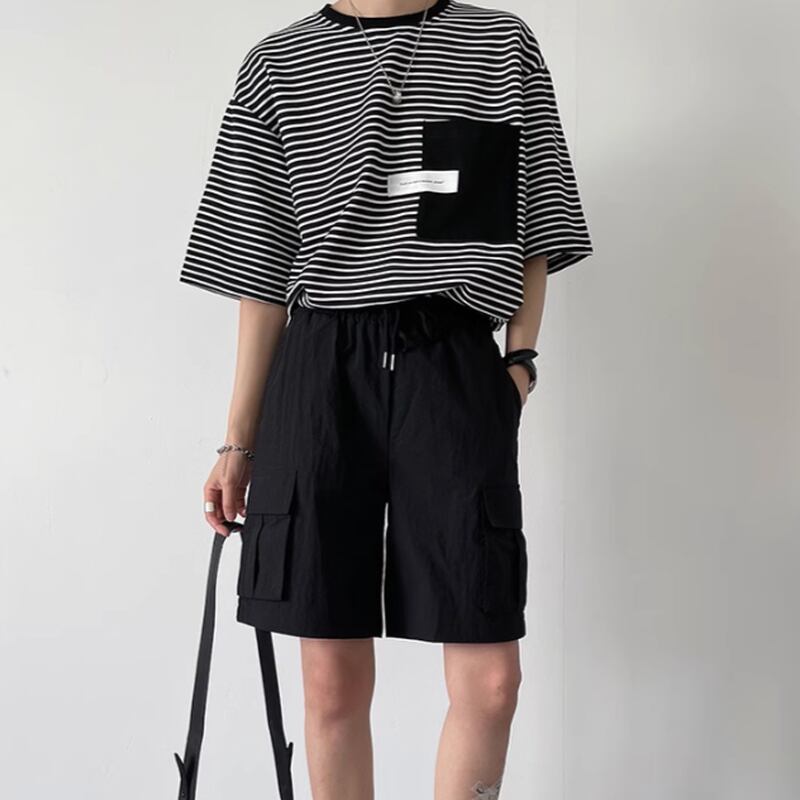 stripe pattern patch pocket oversized short sleeve t-shirt mr0631