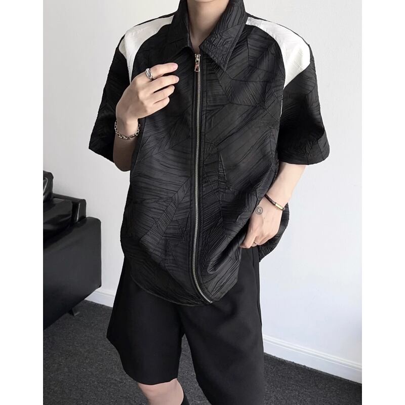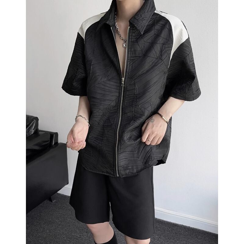 モードな雰囲気漂うジップアップシャツは、シンプルながらも存在感抜群。コントラストの効いたカラーブロックが、着こなしにアクセントを加えます。フロントジッパー仕様で、着脱もスムーズ。ショート丈のデザインは、どんなボトムスとも相性抜群で、スタイルを選ばず着回せます。デイリーユースはもちろん、休日のカジュアルな装いにもおすすめです。