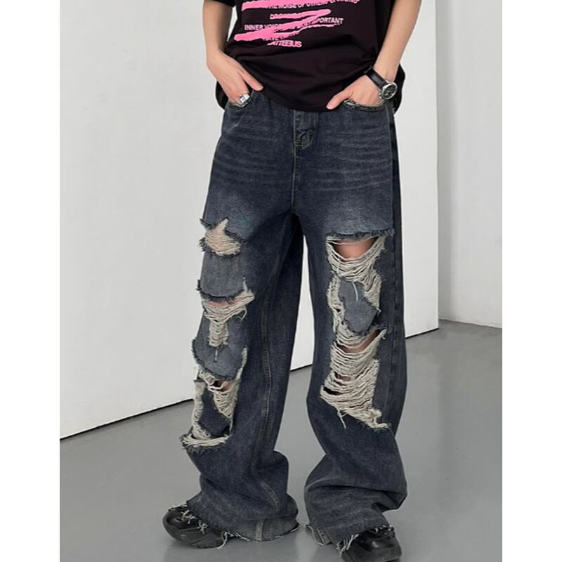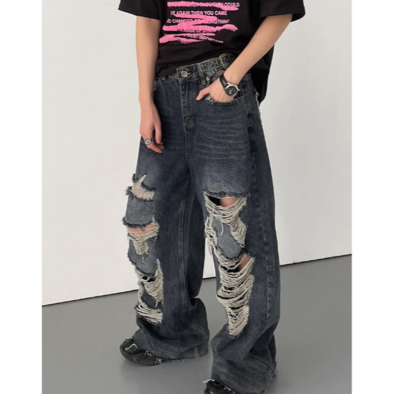 ダメージ加工が施されたワイドレッグデニムパンツ。大胆なダメージ加工が、個性を際立たせます。ゆったりとしたワイドレッグシルエットは、リラックス感とトレンド感を両立。普段使いから特別な日のお出かけまで、幅広いシーンで活躍します。