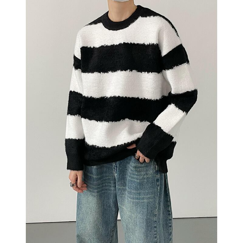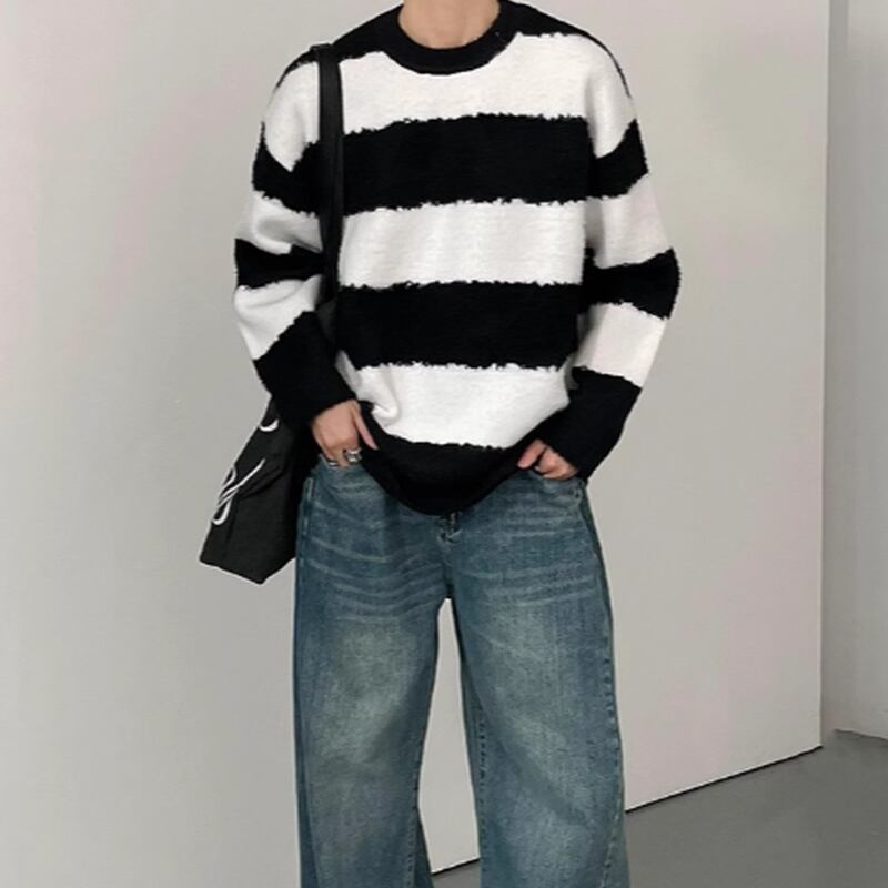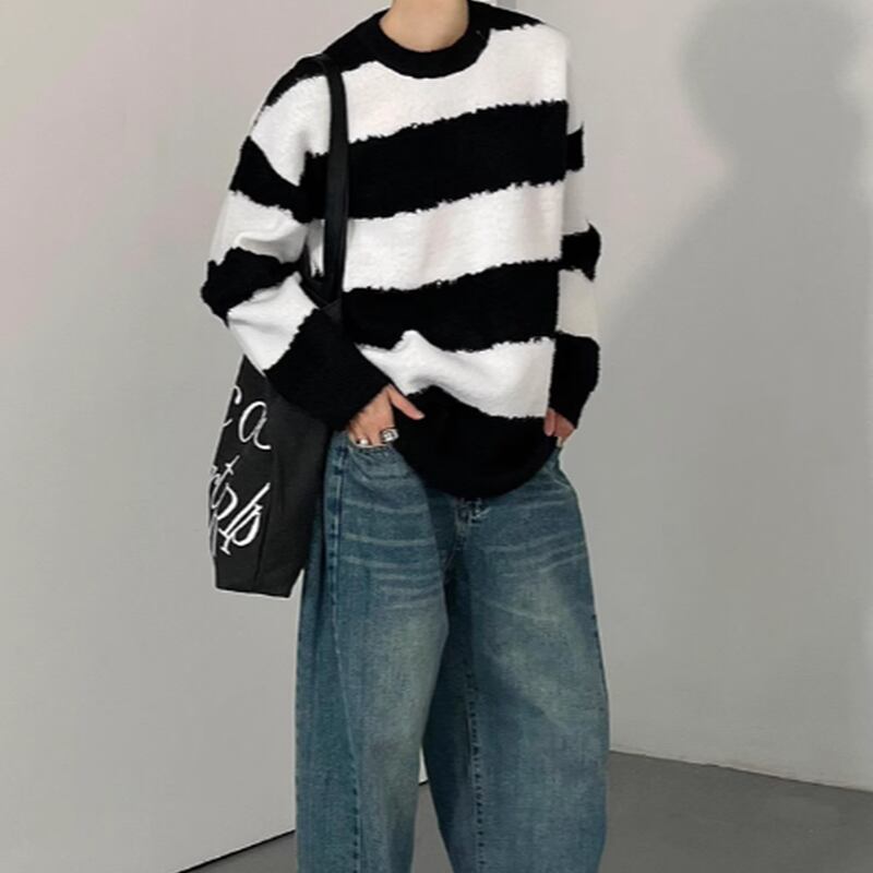 オーバーサイズのストライプニットセーター。ゆったりとしたシルエットで、リラックスした着心地が魅力です。ブラックとホワイトのシンプルなストライプ柄は、どんなスタイルにも合わせやすく、着回し力抜群。カジュアルなスタイルから、少しきれいめなスタイルまで幅広く活躍します。週末のブランチや、友人とのカフェでのひとときなど、色々なシーンで活躍する一枚です。