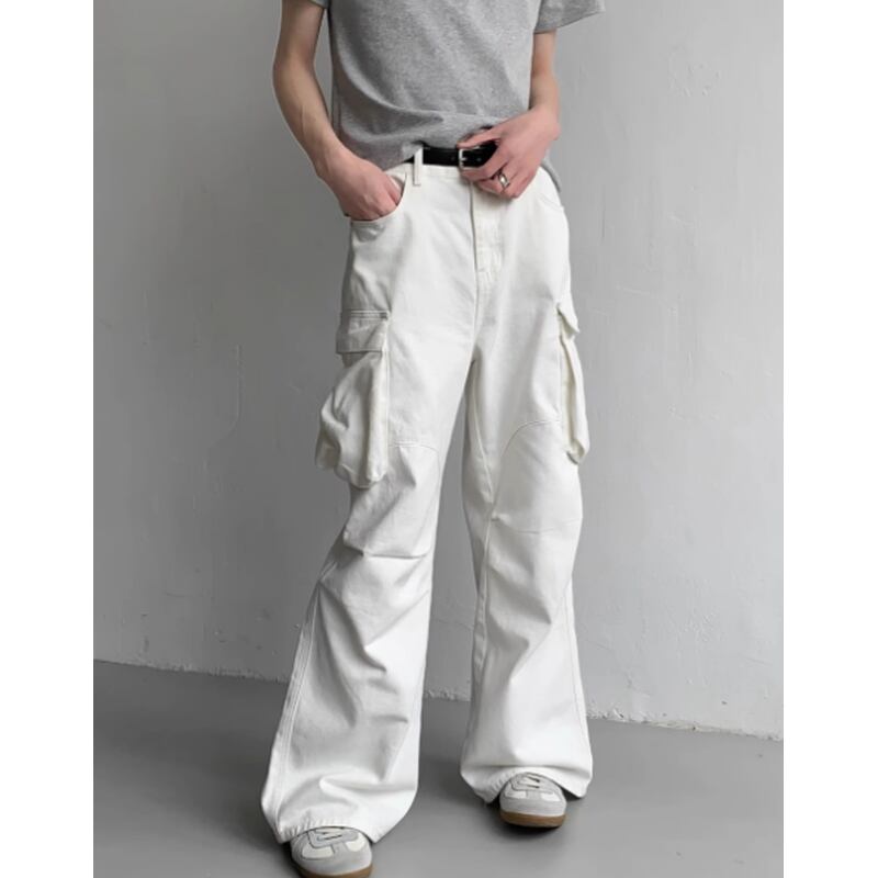 ハイウエストデザインとワイドレッグシルエットが特徴的なカーゴパンツ。ベルボトムのフレアが、足元に抜け感をプラス。カジュアルながらも洗練された雰囲気を演出します。複数のカーゴポケットが実用性を高め、普段使いからちょっとしたお出かけまで幅広く活躍します。