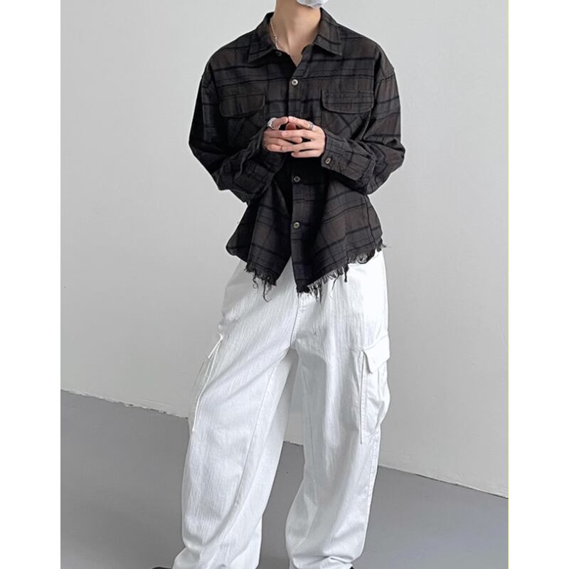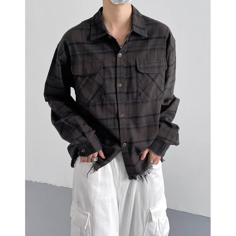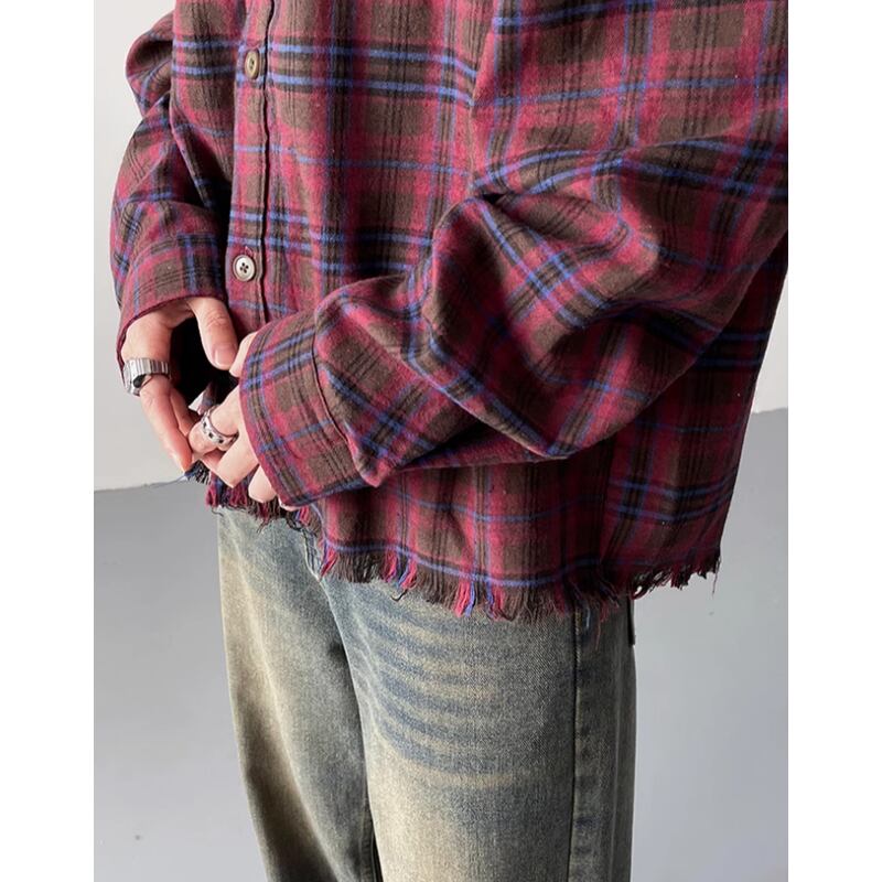 シックなチェック柄が特徴の長袖シャツです。裾のフリンジがこなれた雰囲気を演出します。ボタンを留めてきちんと着こなしたり、羽織としてラフに着こなしたりと、様々なスタイルに合わせやすい一枚です。カジュアルなシーンからちょっとしたお出かけまで、幅広く活躍するアイテムです。