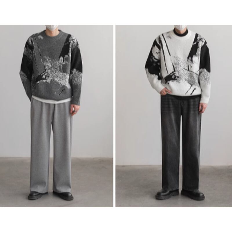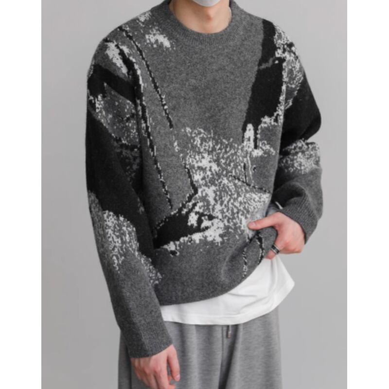 印象的な抽象柄が特徴のニットセーター。クルーネックのシンプルなデザインに、目を惹くパターンが織り込まれ、着るだけで洗練されたスタイリングを完成させます。ロングスリーブで保温性も高く、秋冬のコーディネートに最適です。カジュアルなパンツスタイルにも、スカートスタイルにも合わせやすく、着回し力抜群の一枚です。