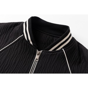 トレンド感と着心地のよさを兼ね備えた、キルトボンバージャケット。程よくゆとりのあるオーバーサイズシルエットで、リラックスした着心地を実現しました。フロントのジッパーと、袖口と襟元のパイピングが特徴的なデザインです。カジュアルな装いにも、きれいめスタイルにも合わせやすく、着回し力抜群の一着です。
