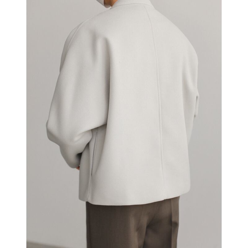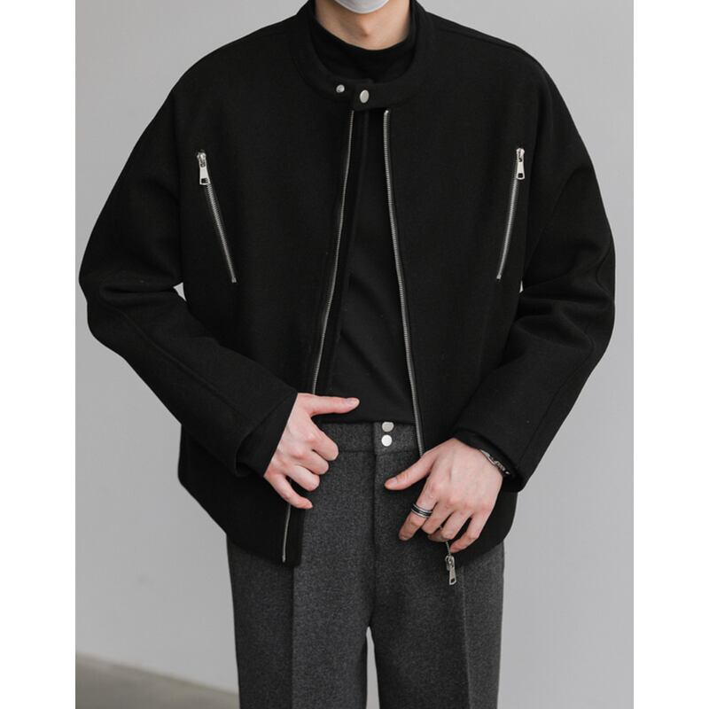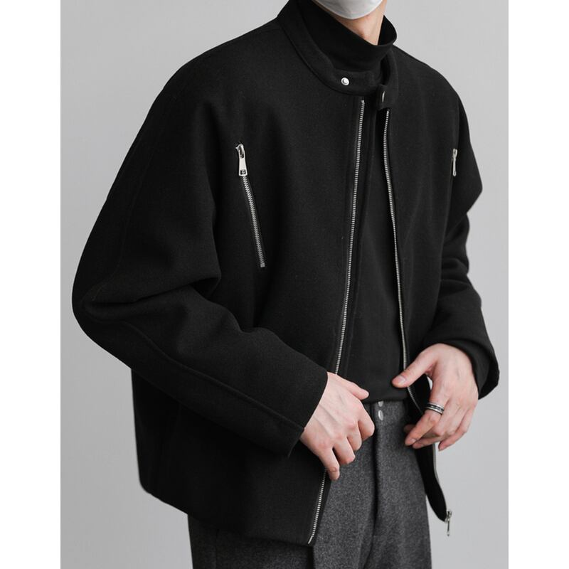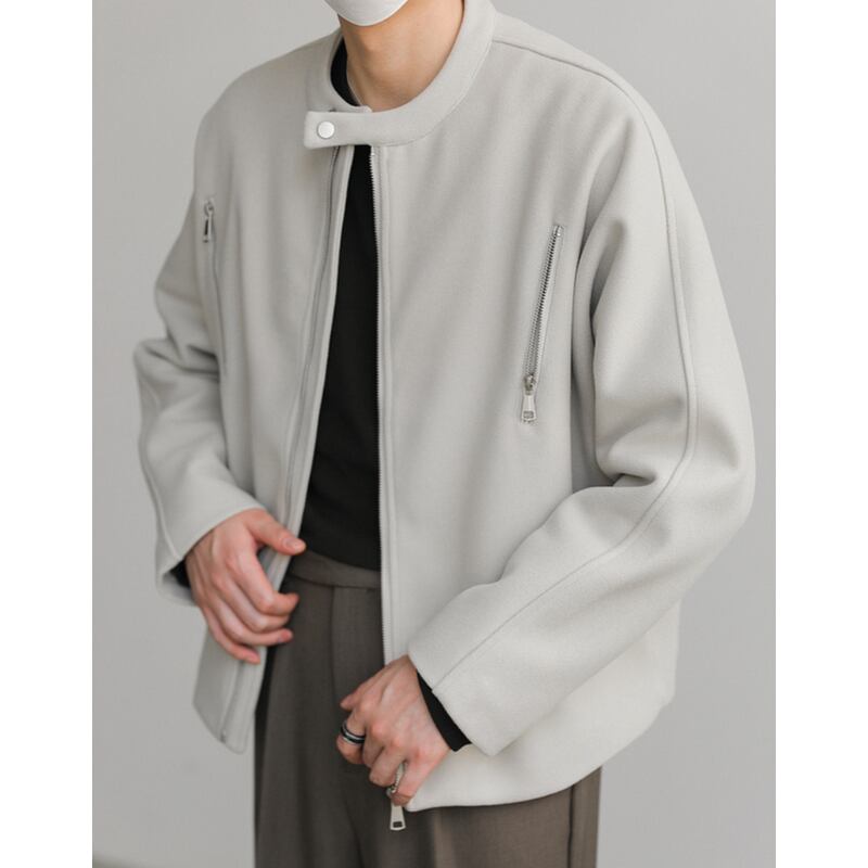 スタンドカラーとダブルジップが特徴的なブルゾンです。すっきりとしたシルエットで、様々なスタイルに合わせやすく、着回し力抜群です。サイドのジップポケットがデザインのアクセントとなり、洗練された雰囲気を演出します。普段使いはもちろん、カジュアルなシーンにもぴったりです。